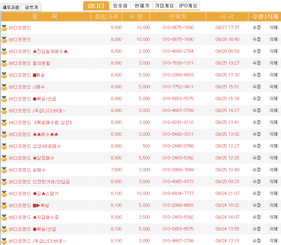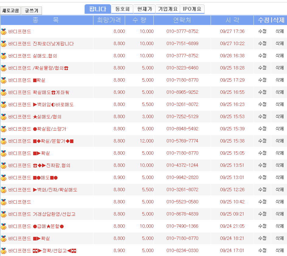 매도 물량이란 실제 바디프랜드 주식을 파는 사람들이 '나는 이 가격에 주식을 팔겠다'라고 올려놓은 게시판 입니다. 전체적으로 8,000원대 물량이 많군요.