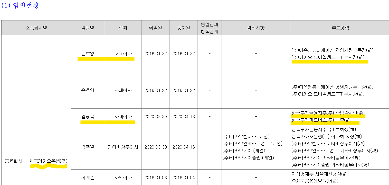 임원 현황을 보시면, 윤호영 대표이사는 다음커뮤니케이션 경영지원부문장과 카카오 모바일뱅크 TFT 부사장의 경력을 가지고 있고, 현재 카카오뱅크를 이끌고 있습니다. 또한 한국투자쪽에서 사내이사와 카카오 계열의 임원들이 비상임이사등을 맡아서 관리하고 있습니다.