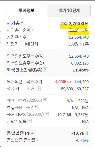 현재 에이치엘비는 시가총액 5조 2,760억원으로 코스닥 3위의 기업입니다. 상장 주식수는 약 5,265만 주입니다. 외국인의 비율은 11.46%로 외국인들이 약 6백만 주의 물량을 확보하고 있습니다. 이익이 없기 때문에 배당수익률은 없네요.