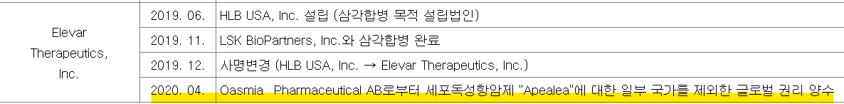 2020년 4월 Oasmia Pharmaceutcal AB로부터 세포독성항암제 "Apealea"에 대한 일부 국가를 제외한 글로벌 권리 양수했습니다.