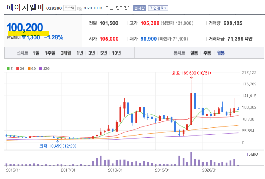 에이치엘비의 월봉의 모습입니다. 아주 순조로운 흐름을 보이고 있습니다. 2019년 10월의 주가 189,600원에서 현재는 조정을 받아 100,200원에 거래되고 있습니다.