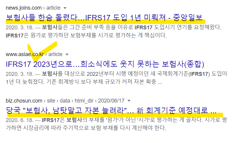 2023년 IFRS17 도입은 엄청난 이슈입니다. 왜냐하면 보험사들이 현재 고객들에게 돈을 지급해야 할 보험금 책정 방식을 바꾸게 됩니다. 그렇게 되면 예전에 고금리, 확정금리 상품을 팔았던 상품들을 현재 원가로 대비해서 자본을 늘려야 하는데요. 현재 저금리와 불황의 경제 속에서 보험사들의 고전이 예상됩니다.