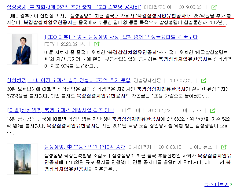 삼성생명은 삼성물산과 공으로 만든 북경의 북경삼성치업유한공사에 지분율을 계속 높이고 있고, 중국에서의 부동산 사업을 확장하려는 모습입니다. 중국 부동산 시장이 좋은 흐름을 보이고 있어 상당한 수익이 예상됩니다.