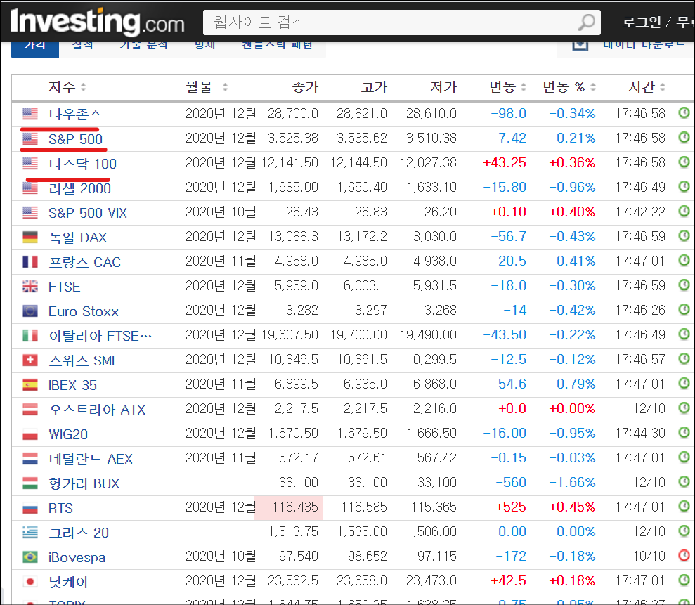 인베스팅닷컴에서는 글로벌 세계 증시를 한눈에 볼 수 있습니다. 투자자들은 글로벌 증시를 언제나 파악을 하고 있어야 합니다. 왜냐하면 글로벌 증시(특히 미국) 증시가 세계 증시의 중심이라고 생각하시면 되는데요.
