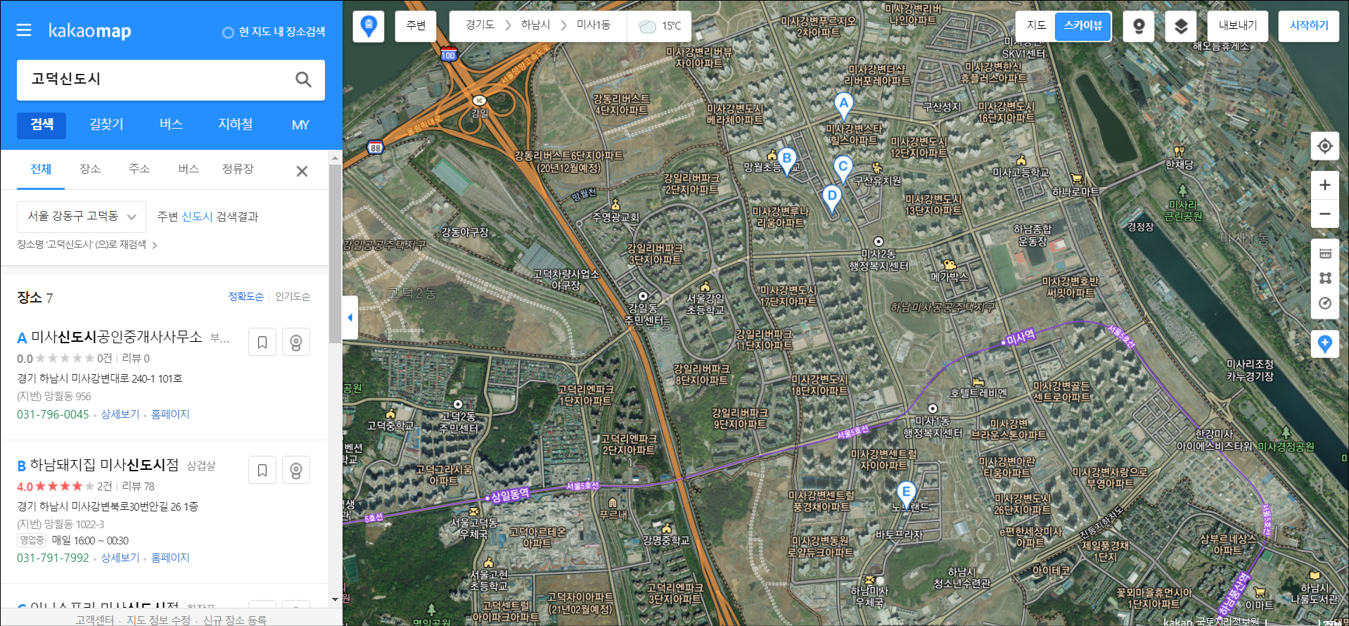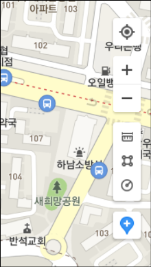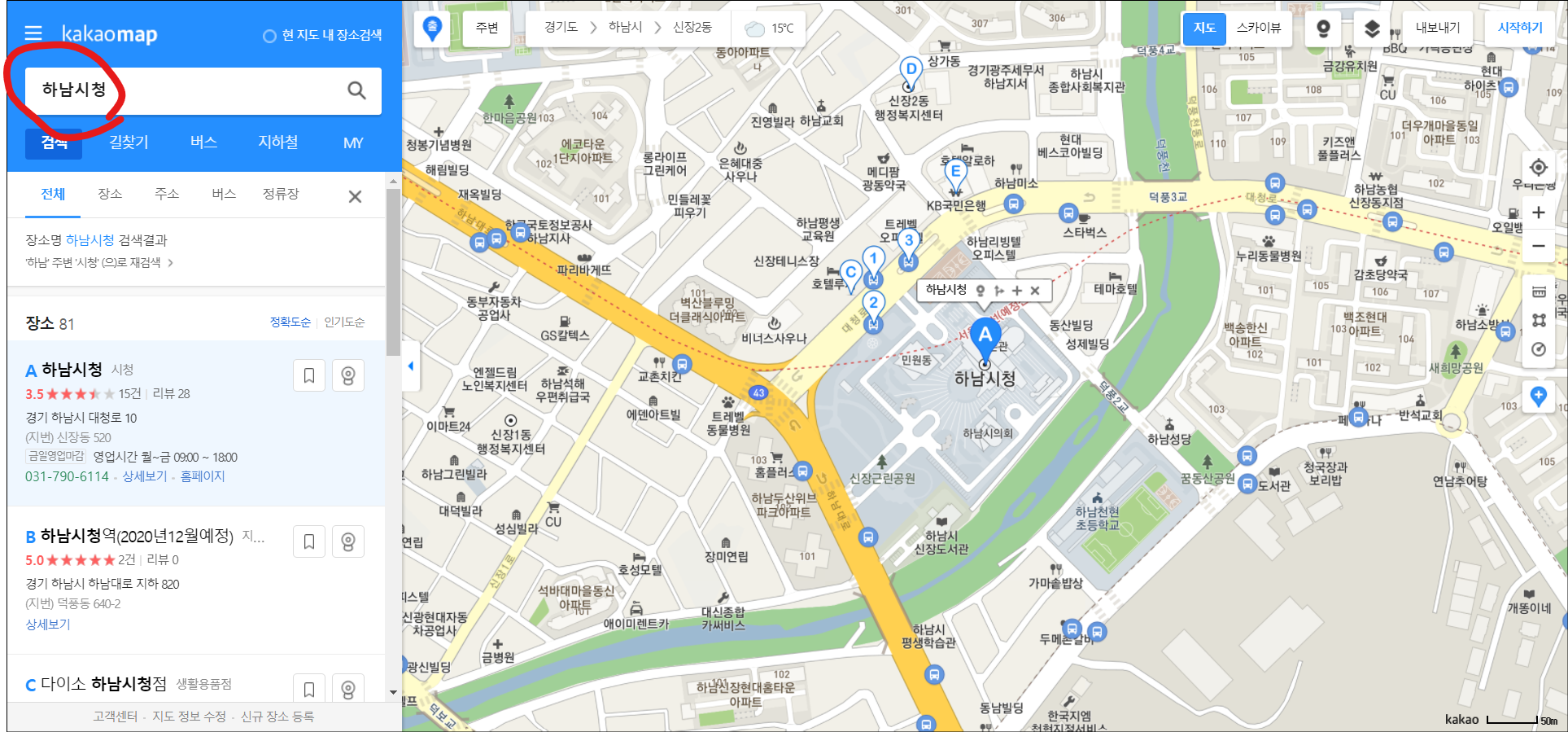 위와 같이 하남 시청에 대해 검색을 해봤습니다. 하남시청에 화살표가 표시가 되고 하남시청과 주변을 검색할 수 있습니다.