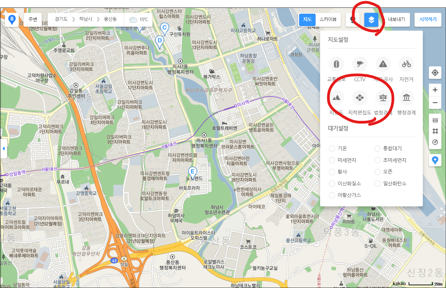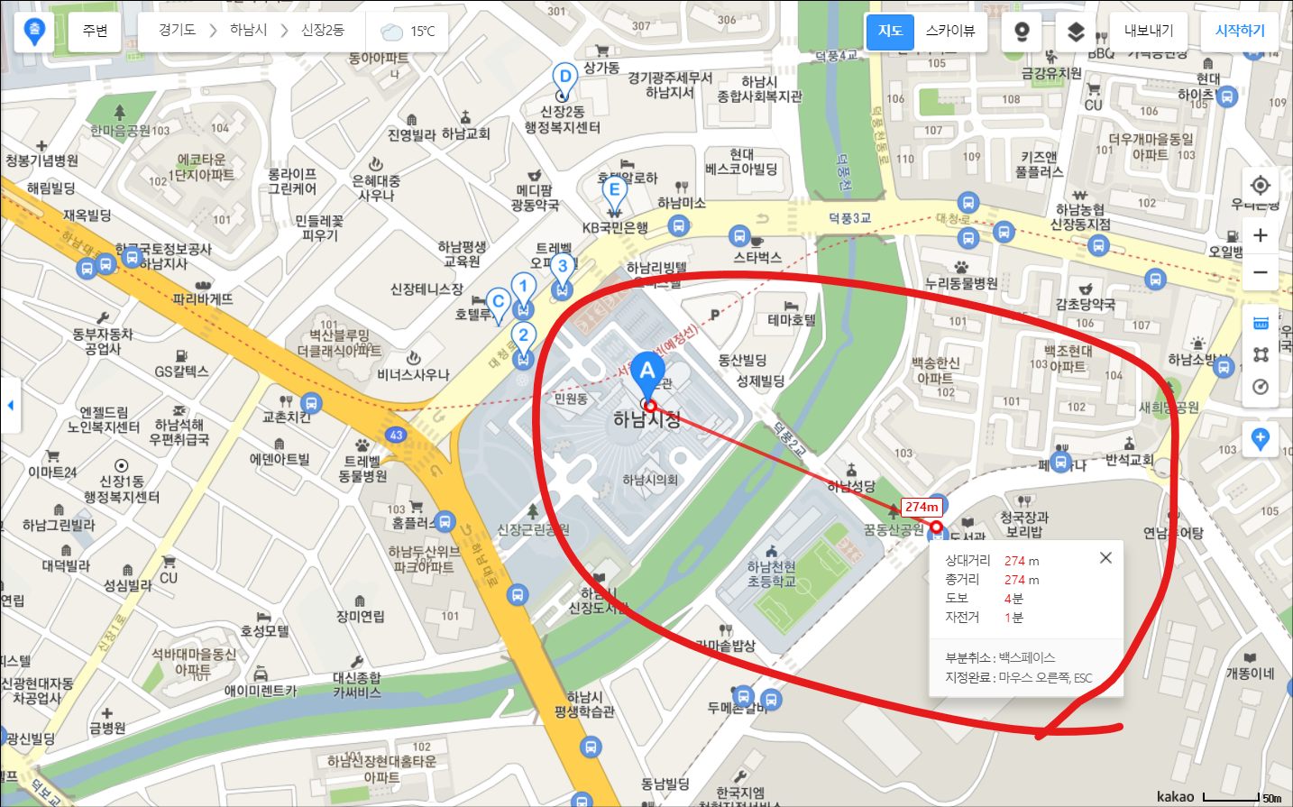 오른쪽에 보시면 거리재기 라는 메뉴가 보이실 겁니다. 그것을 클릭해주면 실제 거리를 계산할 수 있는데요. 저는 하남시청과 도서관의 거리를 계산해 보겠습니다.