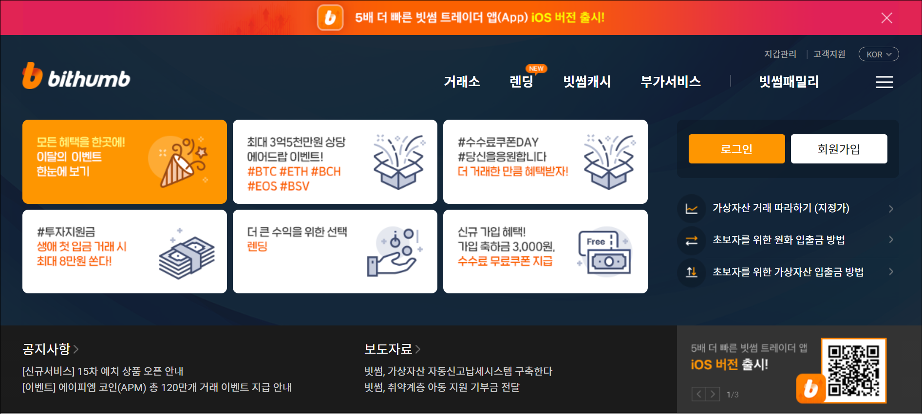 빗썸 거래소의 모습입니다. 예전보다 많이 리뉴얼돼서 아주 깔끔한 모습을 보여주고 있습니다. 또한 iOS 버전도 출시가 되어 아이폰 사용자들도 빗썸 거래소를 어플로 이용하실 수 있습니다.