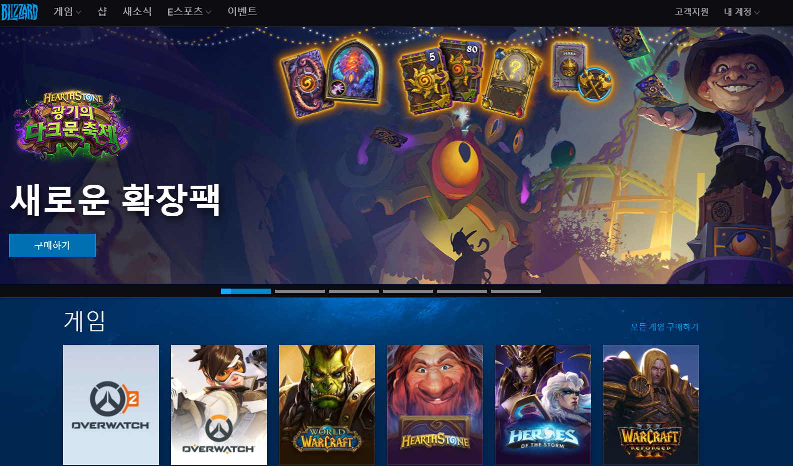 그러면 블리자드 홈페이지에 접속을 할 수 있습니다. 스타크래프트 외에 워크래프트, 오버워치, 하스스톤 등 다양한 게임들을 다운로드할 수 있습니다.