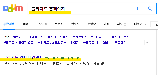 다음 홈페이지에서 "블리자드 홈페이지"를 검색해 주셔서, 아래의 "블리자드 엔터테인먼트" 홈페이지에 접속을 해주셔야 합니다.
