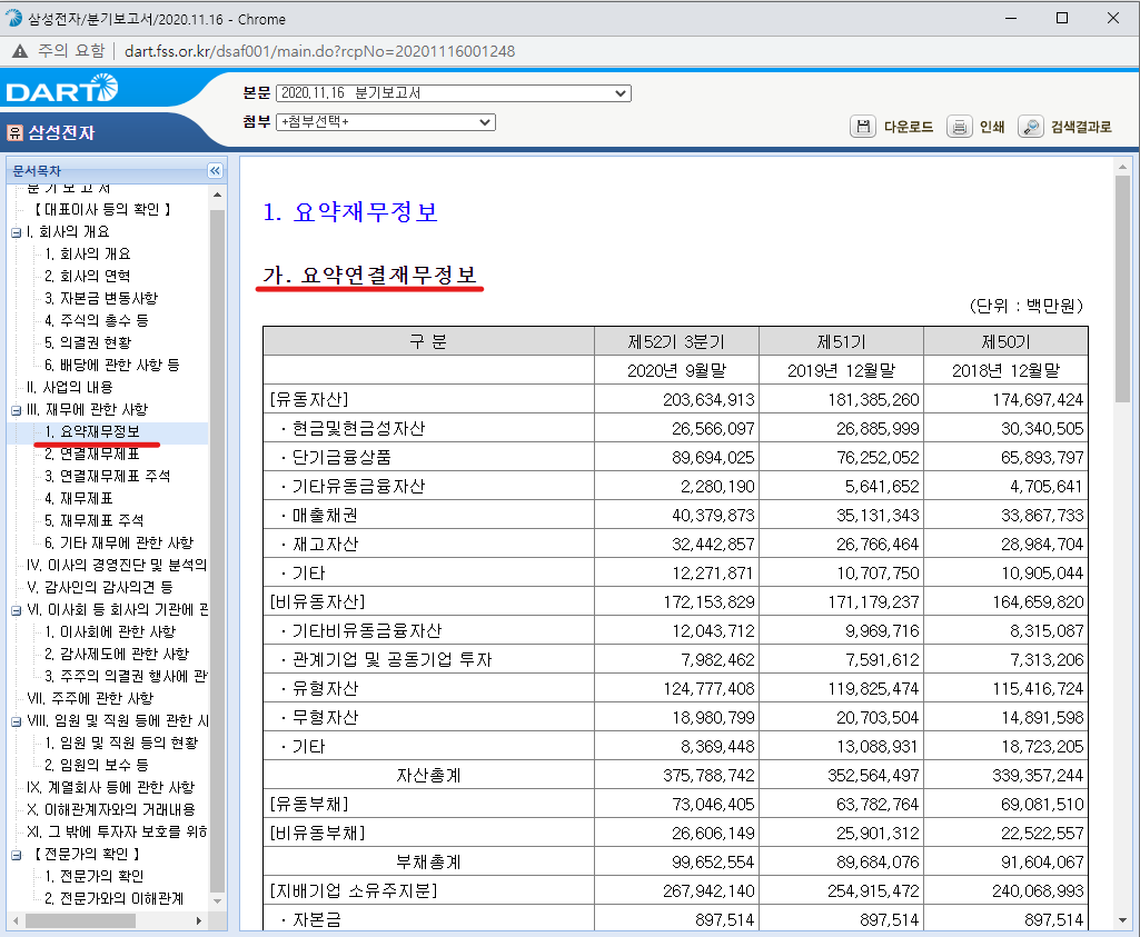 위에 빨간줄을 쳐놓은 분기보고서를 클릭하면, 재무제표(재무상태표)를 확인할 수 있습니다. 삼성전자의 재무제표는 말을 안 해도 엄청나다는 사실은 다 알고 계실 겁니다.