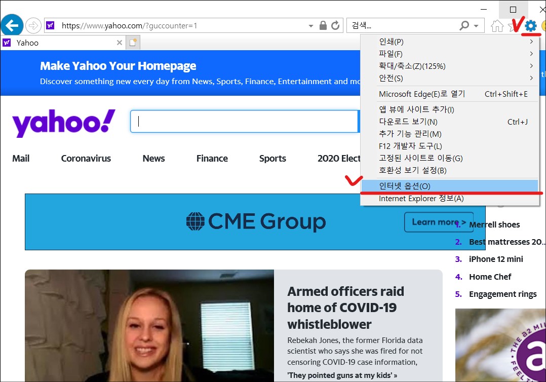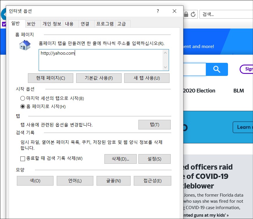 인터넷 옵션을 확인해보면, 기존에 설정해 놓은 설정을 확인할 수 있습니다. 저는 야후로 시작페이지가 설정이 되어 있어서 네이버시작페이지로 변경을 해보겠습니다.