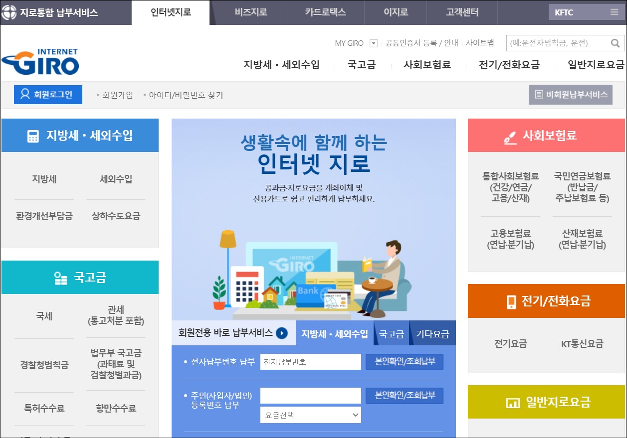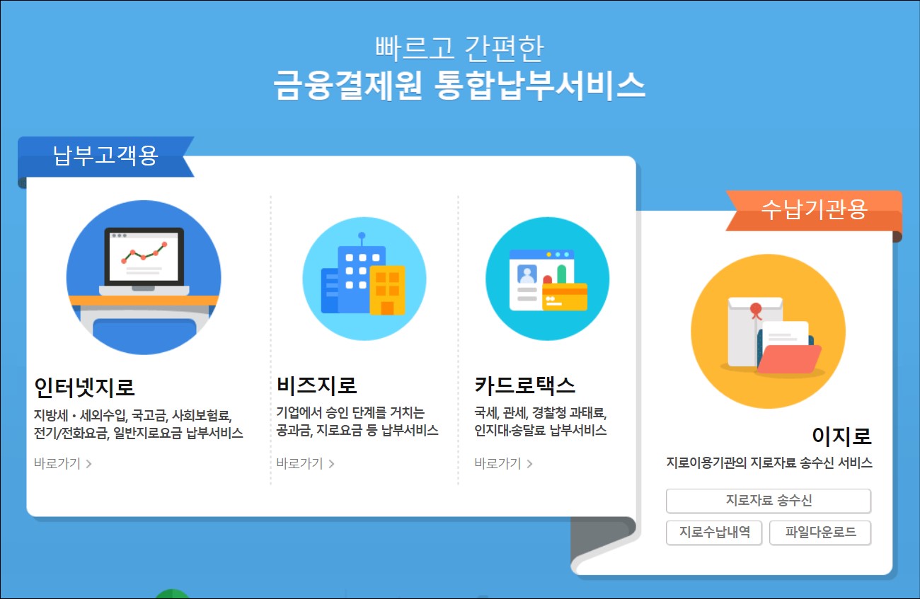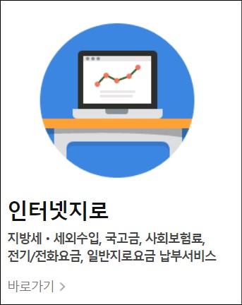 인터넷지로 : 지방세, 세외수입, 국고금, 사회보험료, 전기/전화요금, 일반지로요금 납부서비스를 제공하고 있습니다.