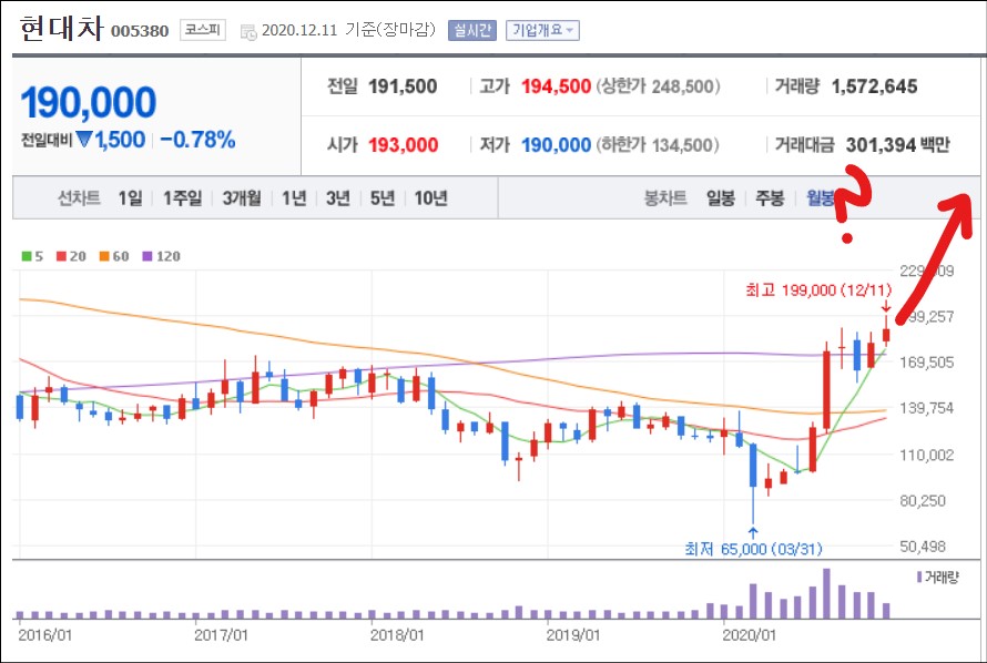현대차의 월봉의 모습입니다. 하락했던 주가가 단기간에 엄청난 상승흐름을 진행하고 있는 모습입니다. 현재 19만 원대의 주가를 형성하고 있습니다.