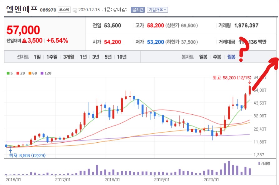 엘앤에프의 월봉의 모습입니다. 올해초부터 본격적으로 반등을 시작해 최고 58,200원을 기록한 후 57,000원대의 거래 가격을 형성하고 있습니다. 차트는 무서울게 없이 질주하는 모습입니다.