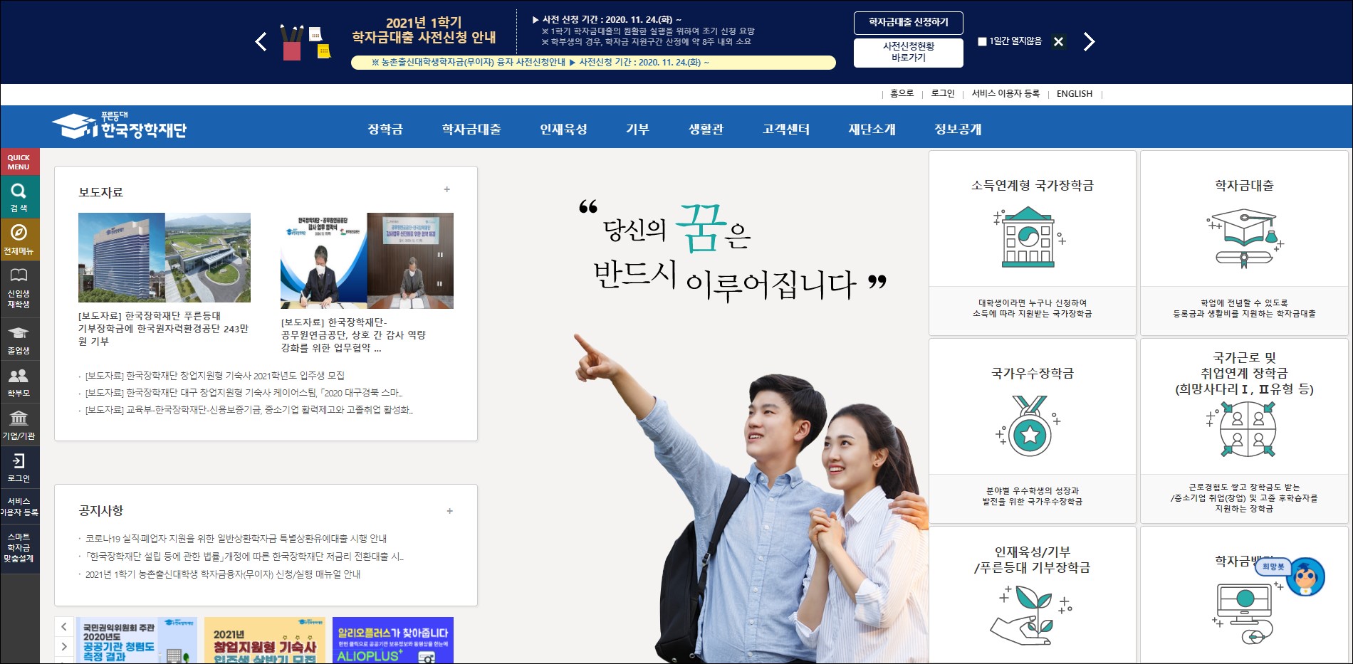 한국장학재단 홈페이지의 모습입니다. 대학생들의 꿈과 희망을 느낄 수 있는 홈페이지 디자인으로 구성되어 있습니다. '당신의 꿈은 반드시 이루어집니다'라는 슬로건이 눈에 들어오네요.