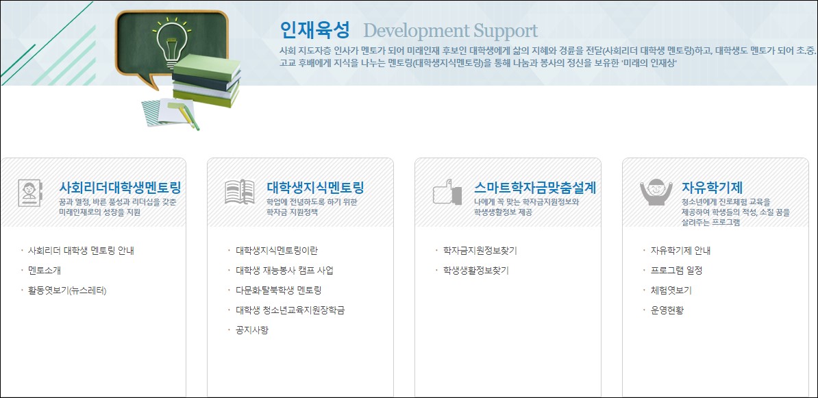 인재육성 메뉴에서는 사회 지도자층 인사가 멘토가 되어 미래인재 후보인 대학생에게 삶의 지혜와 경륜을 전달하고, 대학생도 멘토가 되어 초, 중, 고 학생들에게 나눔과 봉사 정신을 이어주는 서비스입니다.