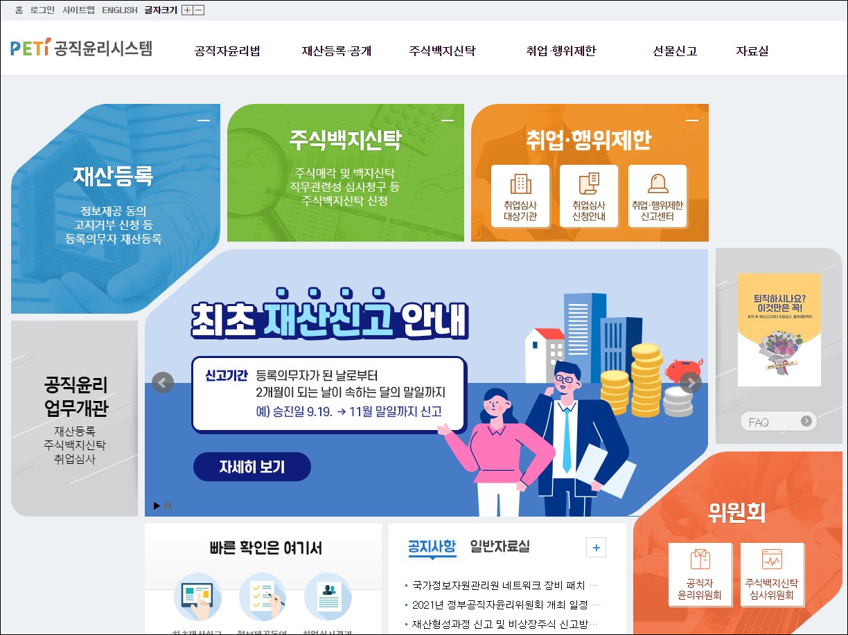 공직윤리시스템을 이용하시는 분들이 꽤 많으신 걸로 알고 있습니다. 공직자 분들은 필수로 접속을 해주셔야 하고 재산 등록 및 주식 백지신탁 업무들을 이용하실 수 있는 서비스이기 때문입니다.