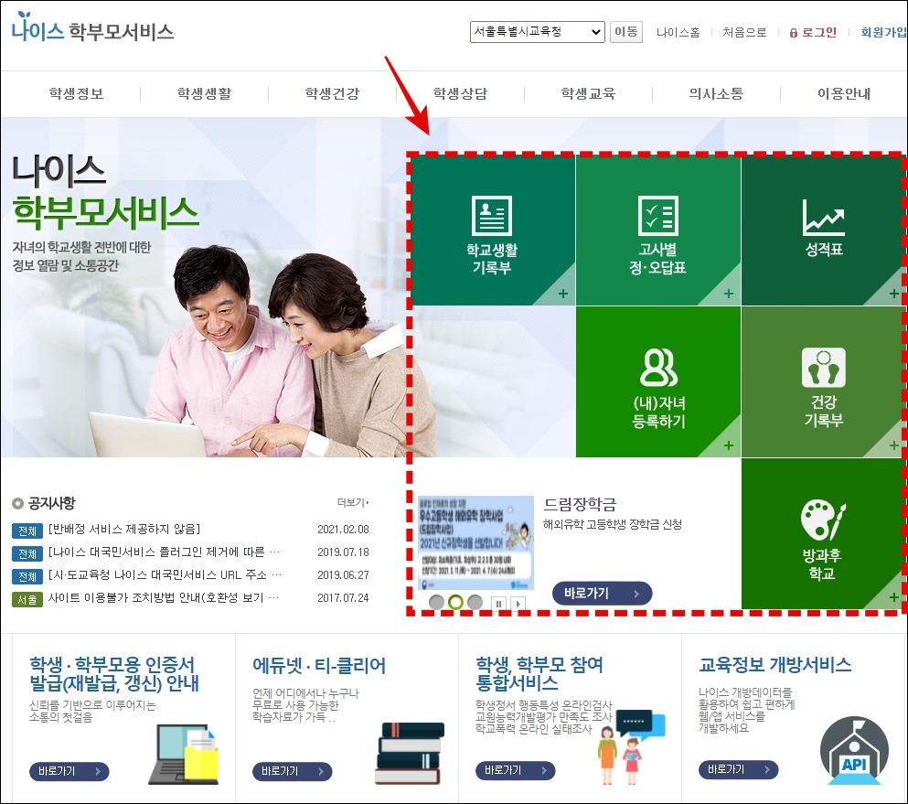 학부모 서비스도 마찬가지로 홈페이지 메인에서 "학부모 서비스"를 클릭해 주시면 됩니다.