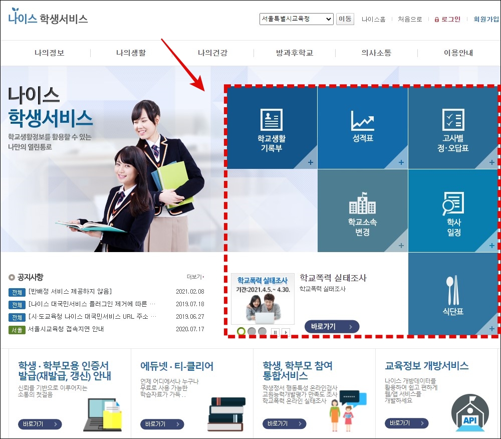 그러면 다음과 같이 내가 선택한 지역의 교육청으로 접속을 할 수 있는데요. "학교생활 기록부", "성적표", "고사별 정 * 오답표", "학교 소속 변경", "학사 일정", "식단표" 등을 확인할 수 있습니다. 회원가입을 하시고 로그인을 한 다음 해당 서비스를 이용하셔야 합니다.