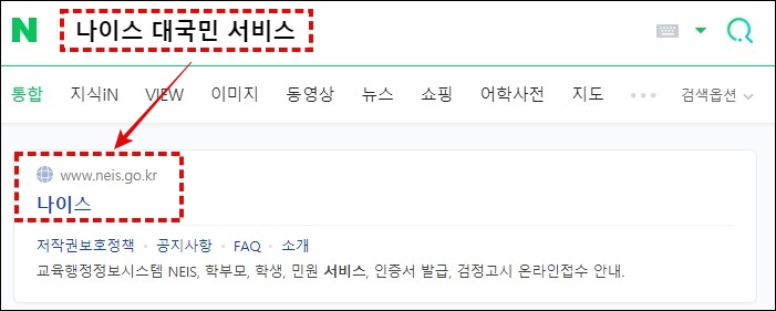 포털에서 다음과 같이 검색을 해주시면, 하단에 "나이스"라는 사이트가 검색됩니다. 이 사이트를 클릭하시면 홈페이지에 접속이 가능합니다.