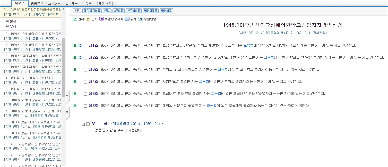 또한 원하시는 법령명을 클릭하시면 해당 법령에 관한 자세한 내용들을 확인할 수 있습니다. 아주 잘 정리되어 있습니다.