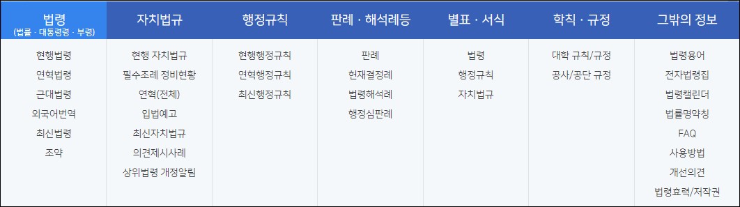 메뉴를 확인해보시면, 법령, 자치법규, 행정규칙, 판례 * 해석례등, 발표 *서식, 학칙 *규정, 그밖의 정보 등의 메뉴들을 확인할 수 있습니다. 현행 법령부터 연혁 법령, 근대 법령 등의 법령을 확인할 수 있고, 자치 법규에 대해서도 확인할 수 있습니다. 그리고 많이 확인하시는 정보가 판례와 해석례 부분 등입니다.