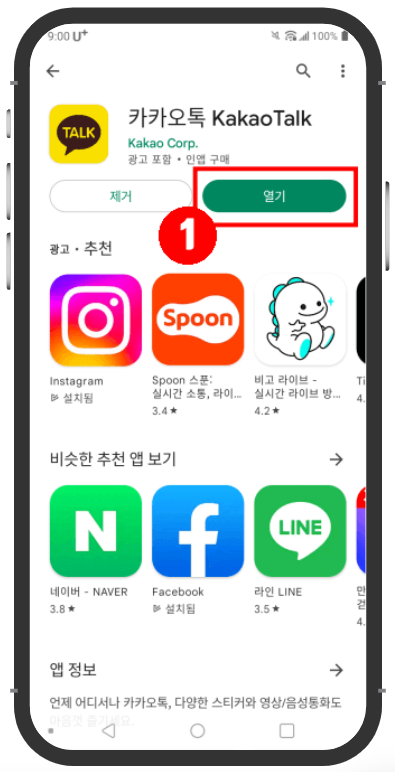 '카카오톡'이 맞는지 리뷰와 다운로드 횟수를 체크하신 후 '설치' 버튼을 눌러주세요.