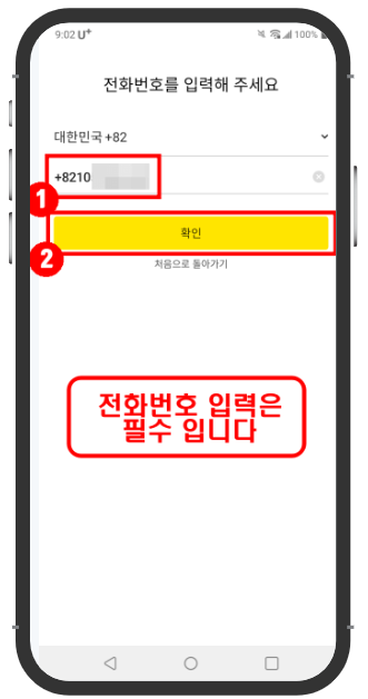 본인이 사용하고 있는 전화번호를 입력해 주시면 됩니다. '대한민국+82'는 기본 설정으로 세팅되어 있으니 '010-xxxx-xxxx'번호만 1번에 입력해 주시고, '확인' 버튼을 눌러주시면 됩니다.