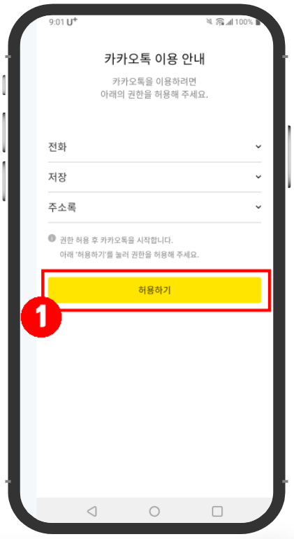 카카오톡에 처음 접속을 하시면 권한 설정을 진행하셔야 하는데요. 전화, 저장, 주소록 등을 카카오톡에서 이용하려면 권한 허용을 해야 합니다. '허용하기' 버튼을 눌러주시면 됩니다.