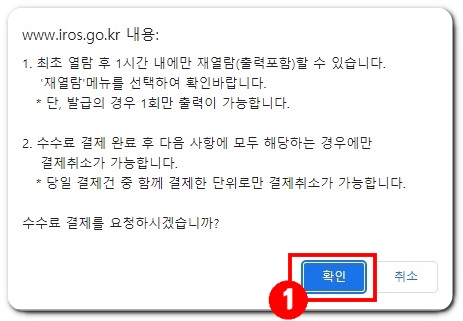 결제에 관련된 내용들을 확인해 주시고, '확인' 버튼을 클릭해 주시면 됩니다. 열람을 하시면 1시간 내에만 재열람 가능하고, 발급의 경우 1회만 가능하다는 공지사항을 확인할 수 있습니다.